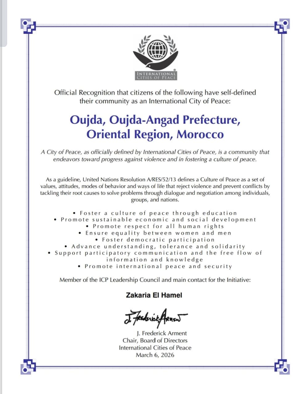 "It’s official! 📜 Oujda is recognized as an International City of Peace. A proud moment for Morocco and the Oriental Region. As a member of the ICP Leadership Council, I am ready to lead this journey toward education, equality, and lasting peace. 🕊️🇲