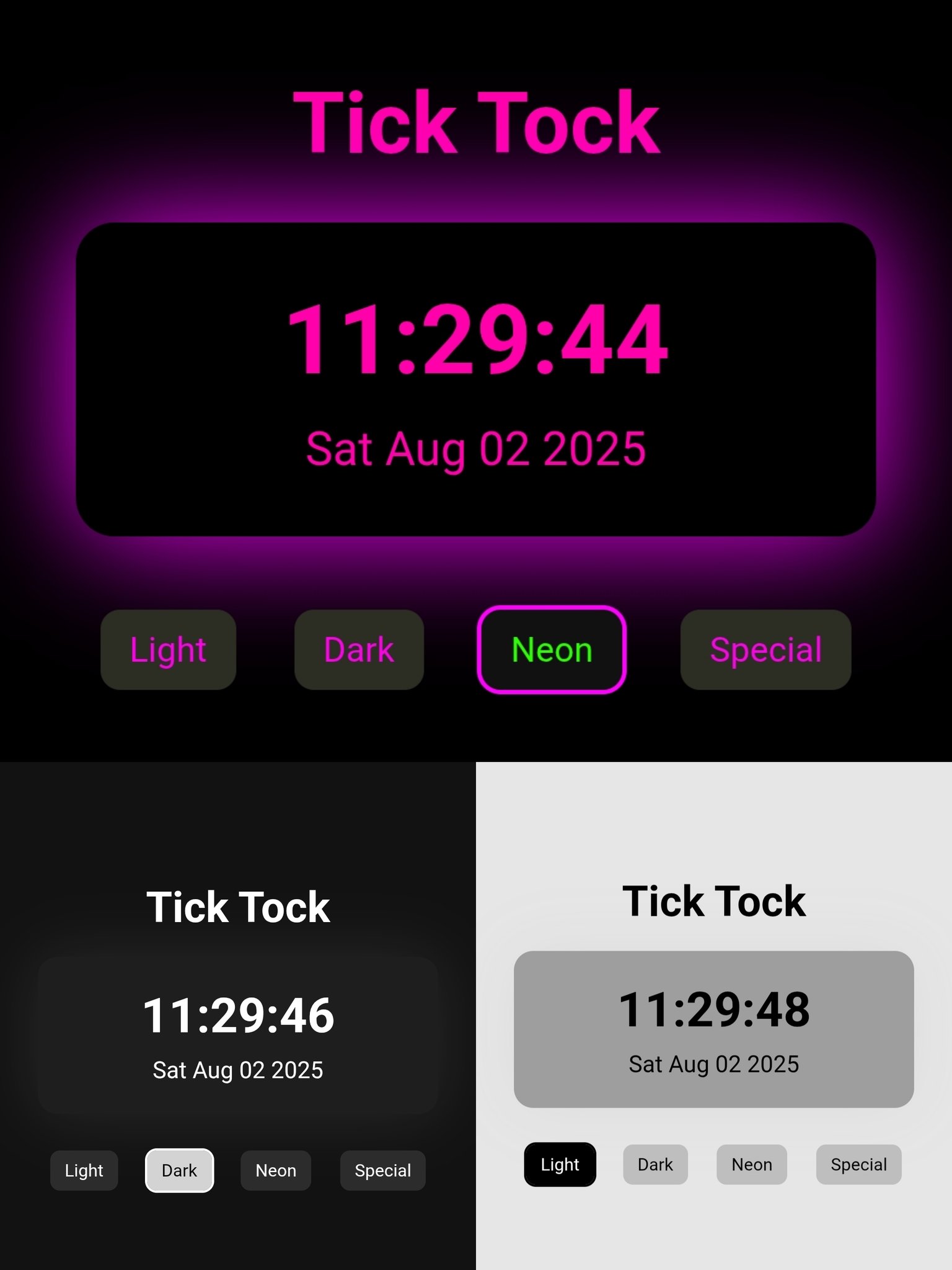 Argha Roy Chowdhury @roychowdhury_ar · Aug 2, 2025 Just built a 🔥 Clock App using HTML, CSS & JS! 🕒 Supports 4 modes: ✨ Light, Dark, Neon (digital) ⭐ Special mode = Analog clock w/ real-time rotation! Try itick-tock-arghya.netlify.appLk Gitgithub.com/roychowdhury-a…4j Comments Below �� #JavaScript #Frontend #100DaysOfCode #WebDAbg 1 5 74