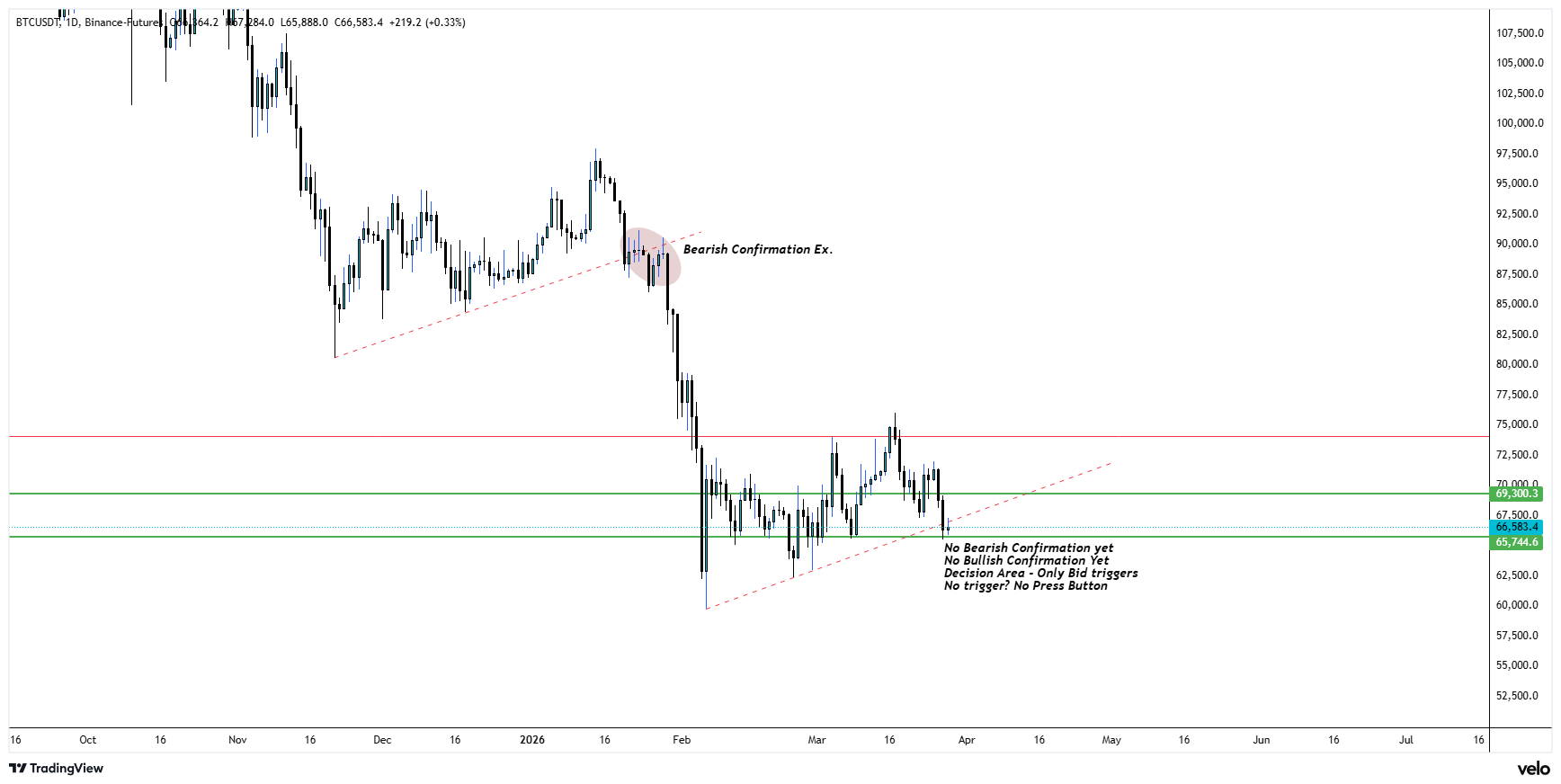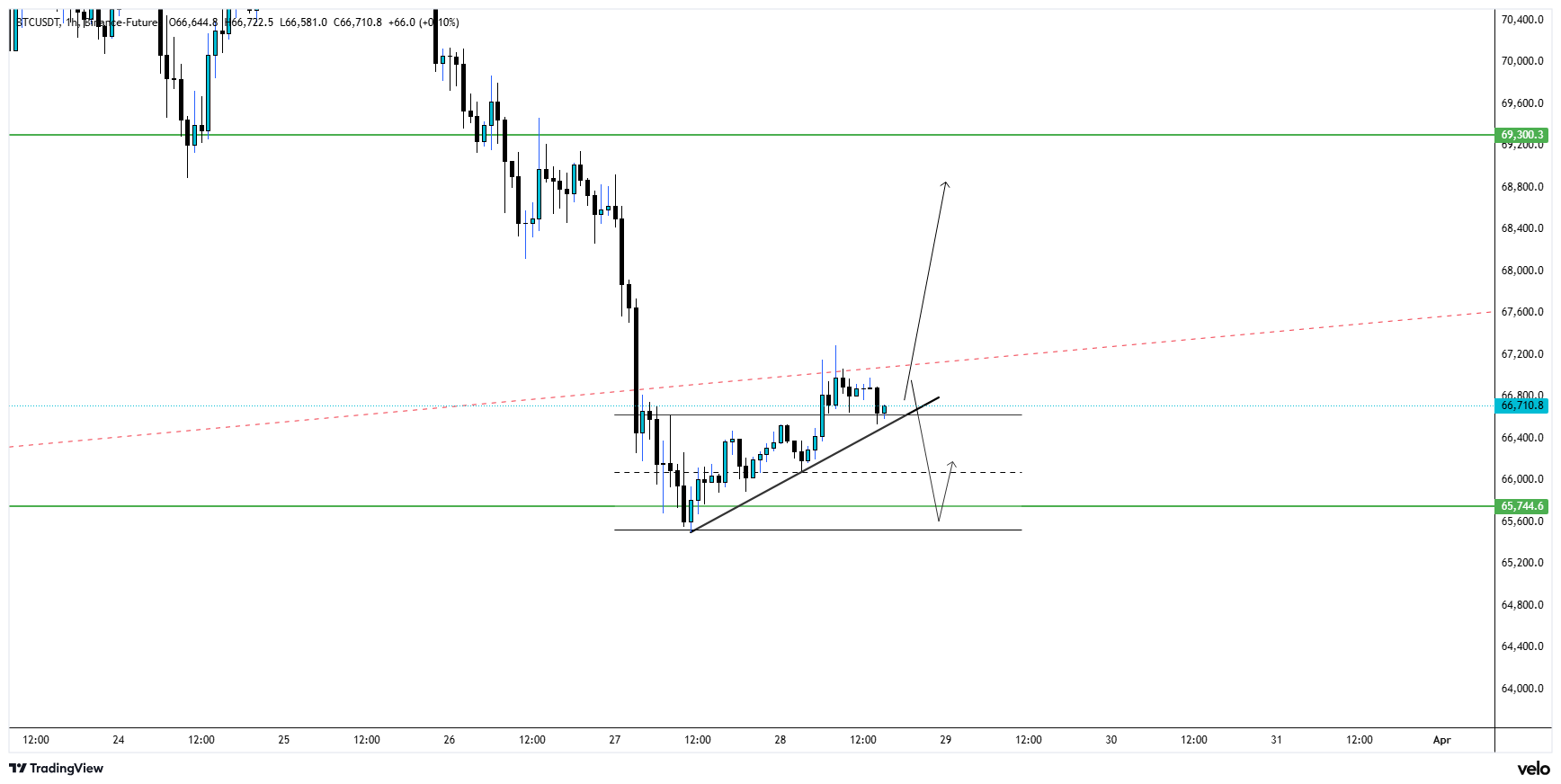 - H1 M15 looks good as of now. Price soared past LTF range resistance and is sustaining, but trend looks weak. I'm long from 65,979 with 60x lev, took 50% profits this morning. My risk is eliminated and profits are booked.
