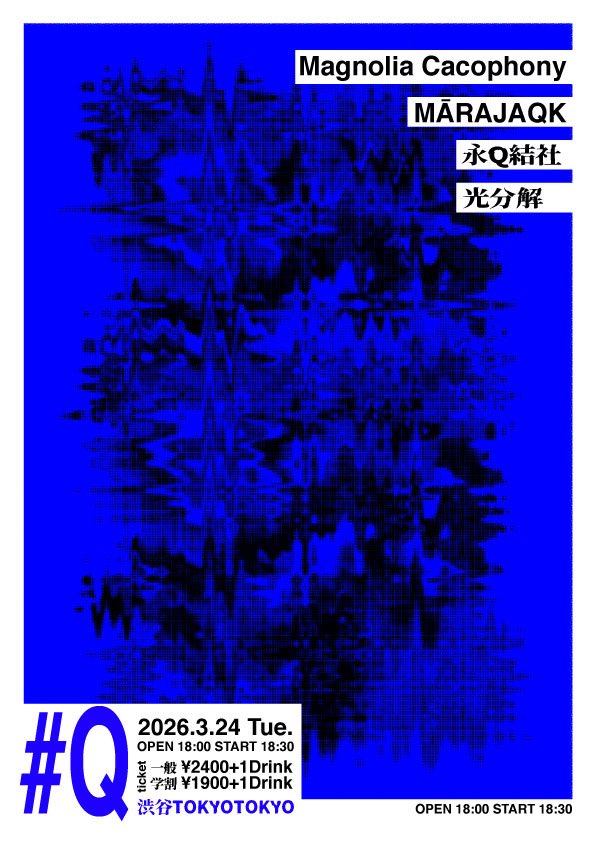 光分解 @HikariBunkai · 4d 2026.03.24(火) 「#Q」@渋谷TOKIO TOKYO OP/ST 18:00/18:30 一般:¥2400+1D 学割:¥1900+1D 永Q結社 MĀRAJAQK Magnolia Cacophony 光分解 Flyer Design:uma ticket↓ livepocket.jp/e/rj4h- こちら明日に迫っております。思い切りやりますので、ぜひお越しください。 1 4 433