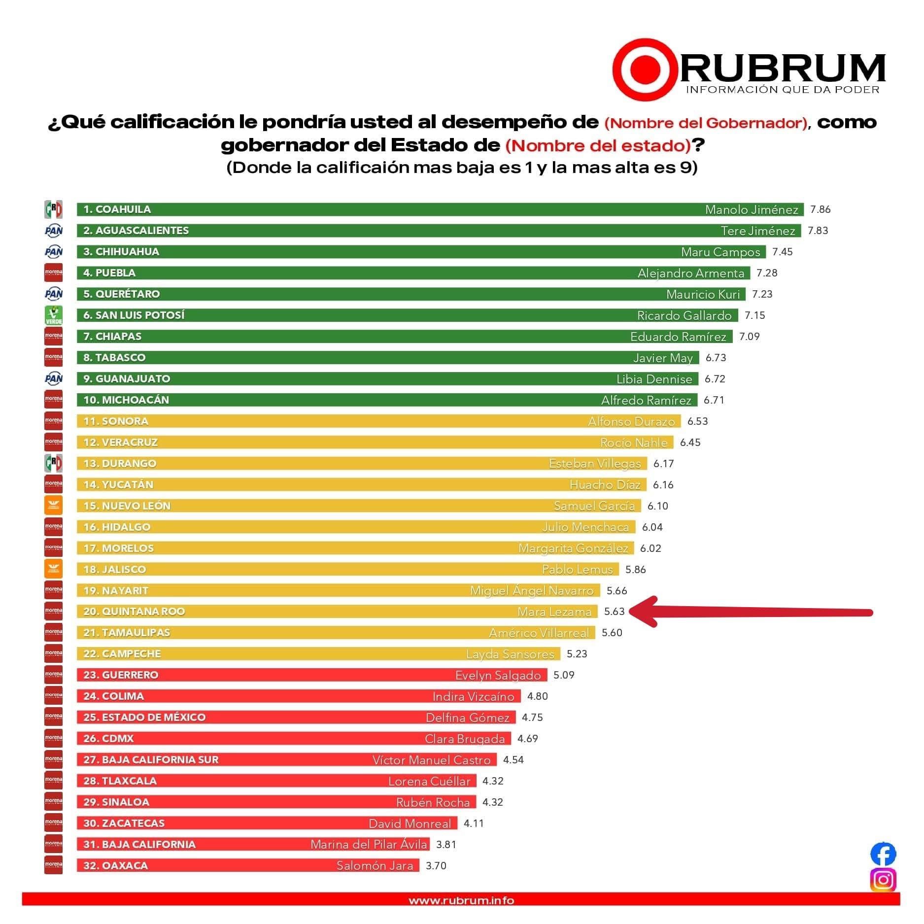 #Desempeño la encuesta coloca a la morenista en el lugar número veinte, por debajo de gobiernos como Nayarit y Jalisco, un claro ejemplo del rechazo y descontento social al gobierno humanista de Mara Lezama.