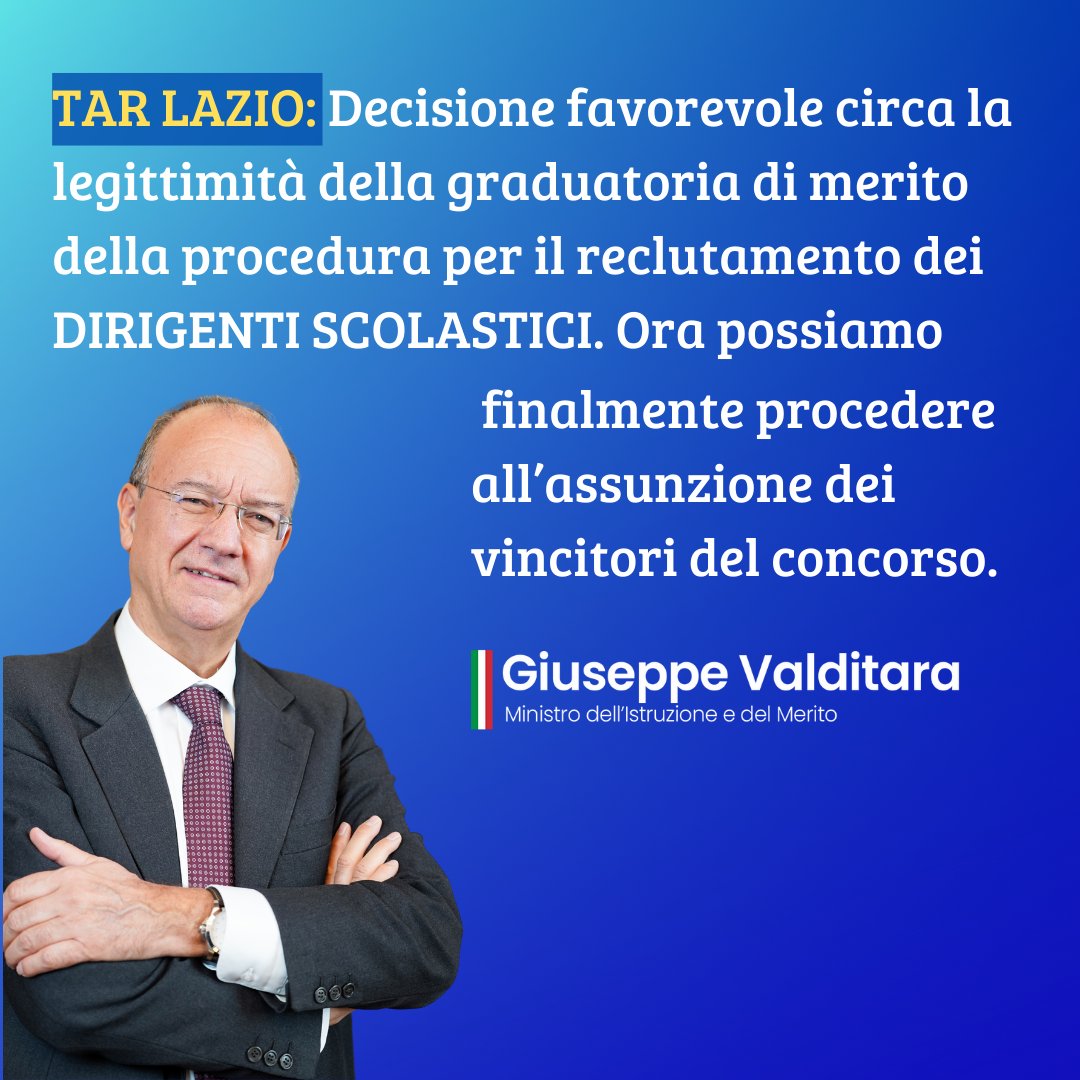 #Scuola, decisione favorevole del #TAR Lazio circa la legittimità della graduatoria di merito della procedura riservata per il reclutamento dei dirigenti scolastici bandita nel 2023. Ora possiamo finalmente procedere all'assunzione dei vincitori del concorso.