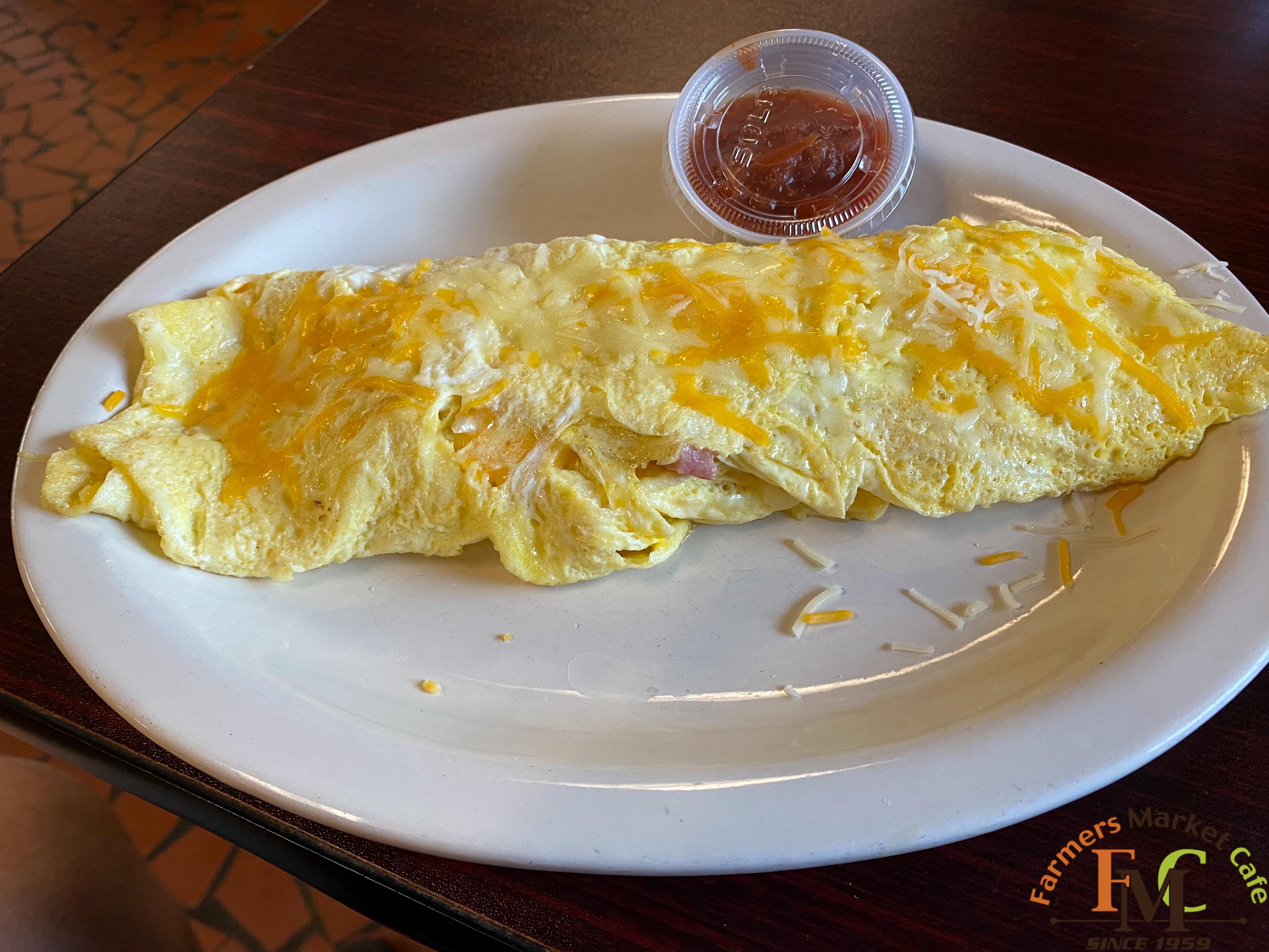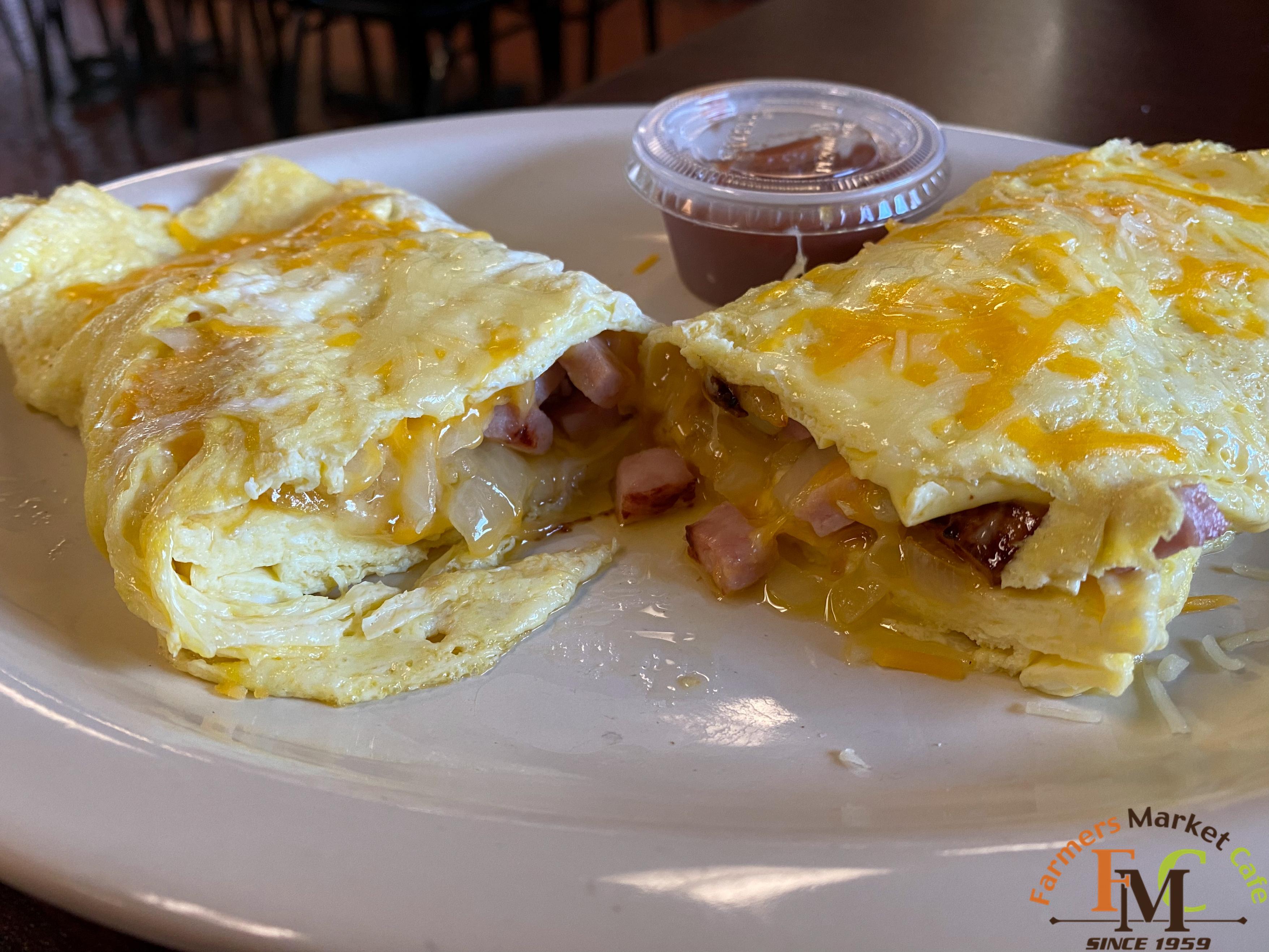 🍳 Indulge in our mouth-watering western omelette made with three farm-fresh eggs, savory ham, crisp bell peppers and onions, and gooey melted cheddar jack cheese. 🧀 Join us at the Farmers Market Cafe located at 315 N. McDonough Street for a delicious breakfast experience. #f..1E