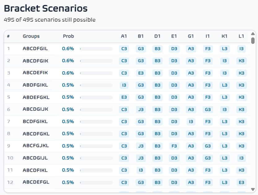 🎯 Group winners A1, B1, D1, E1, G1, I1, K1, L1 will learn their R32 opponent depending on which 1 of those 495 combinations "wins".