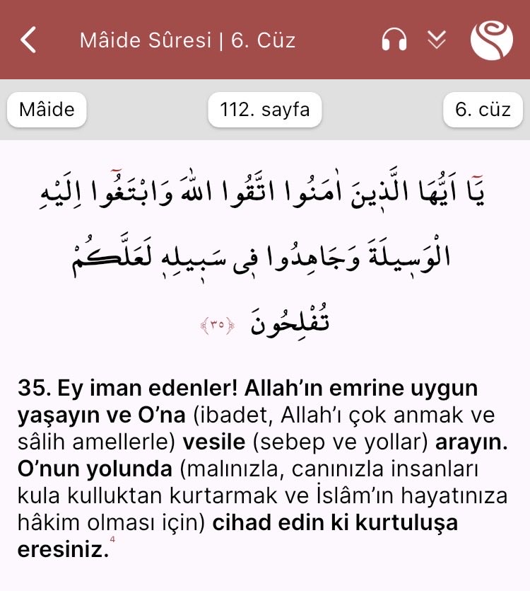 Allah’ın emrine uygun yaşayın (takvâ) ve O’na (araya aracılar koyarak değil, ibadet, Allah’ı çok anmak ve sâlih amellerle yaklaştırıcı ve rızasını kazandırıcı) vesîle/sebep ve yol’(lar) arayın.“