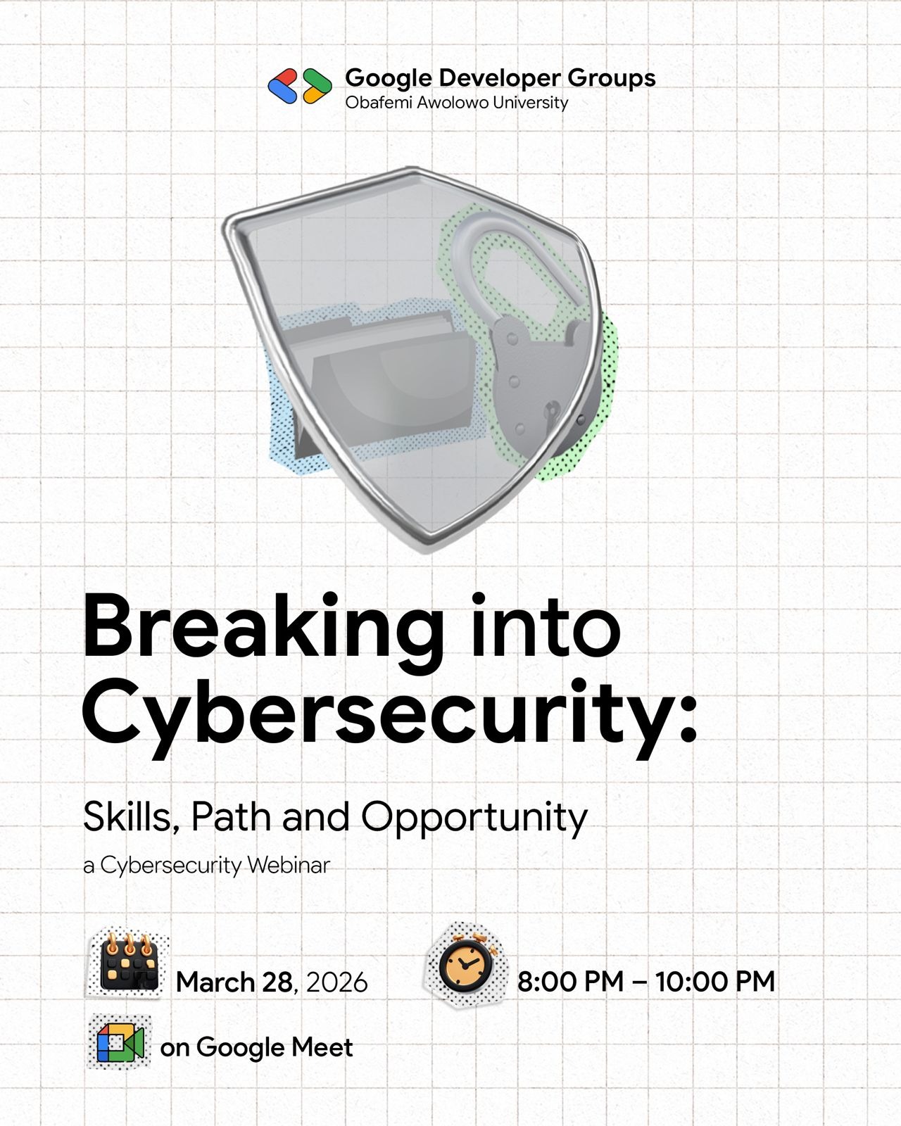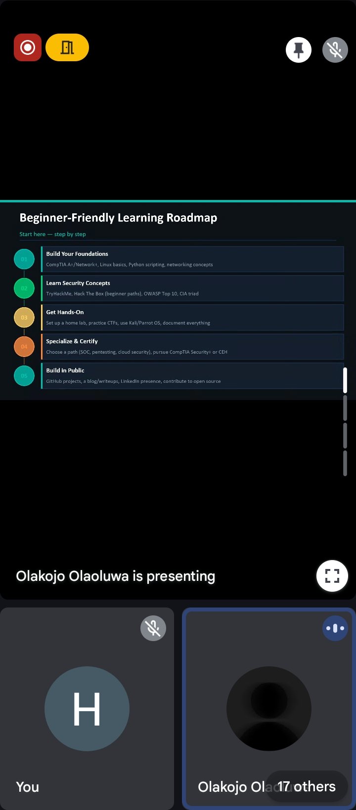 I joined the "Breaking into Cybersecurity" webinar by @GDGOAUCybersec on Google Meet.