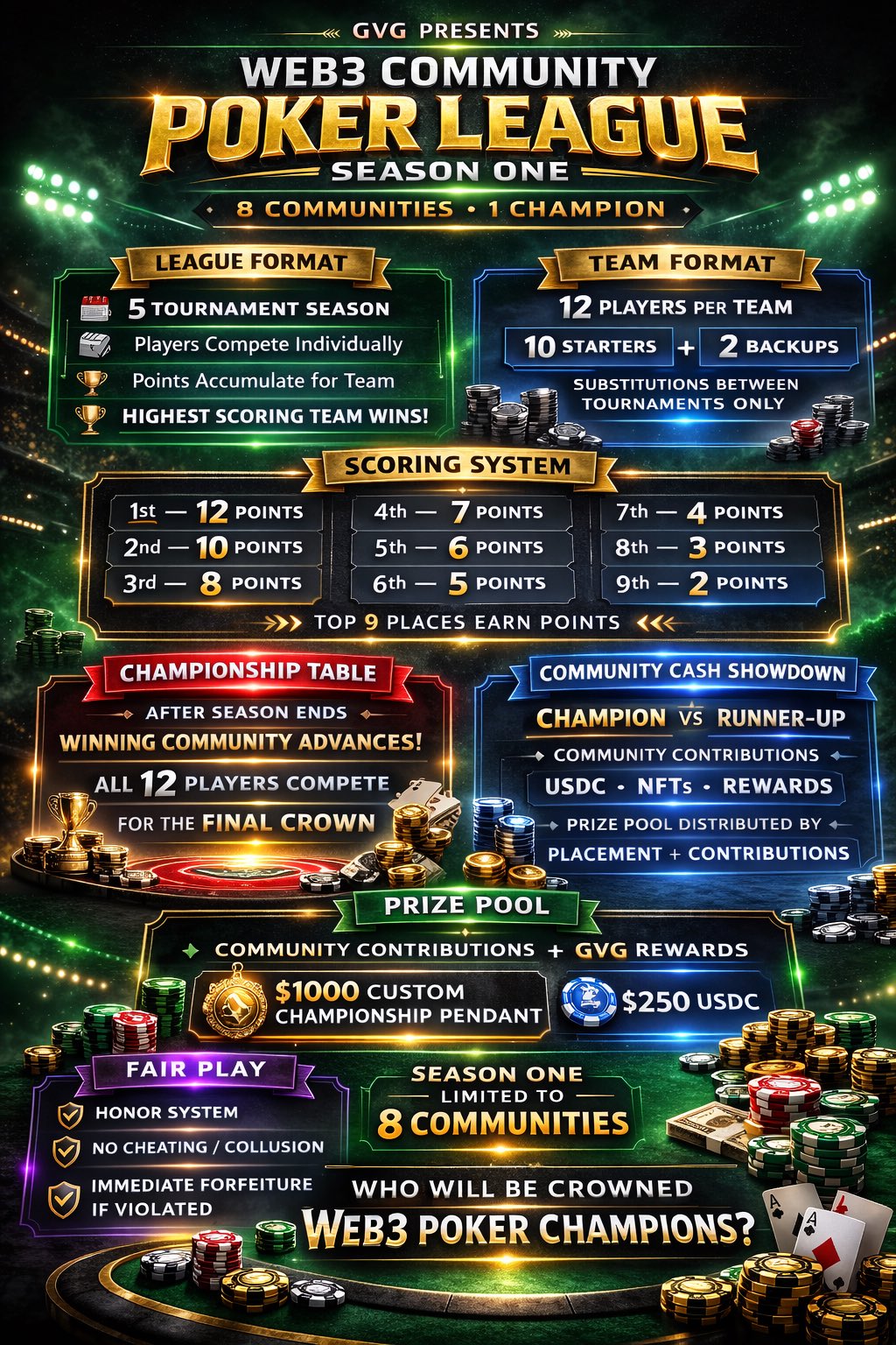 Cheating, collusion, chip dumping → instant boot + community DQ.