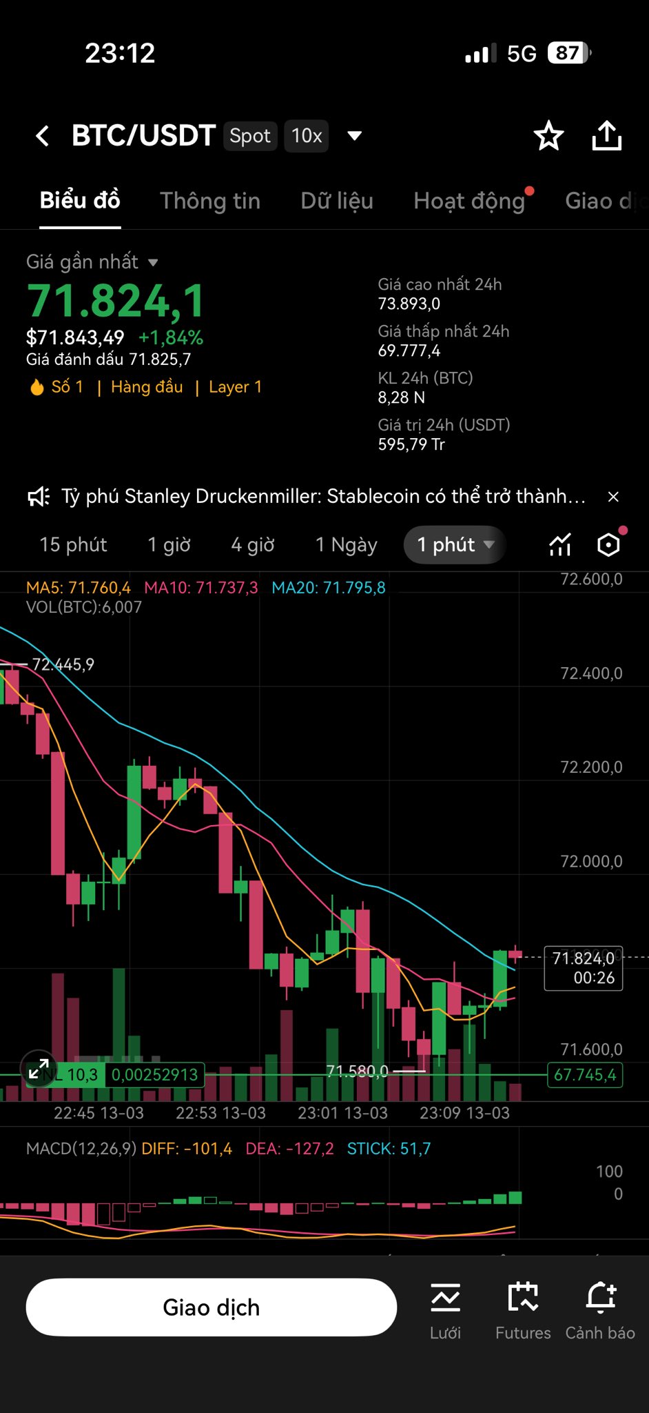 Hiện tại ~$71,800 USD (+2.3% 24h)