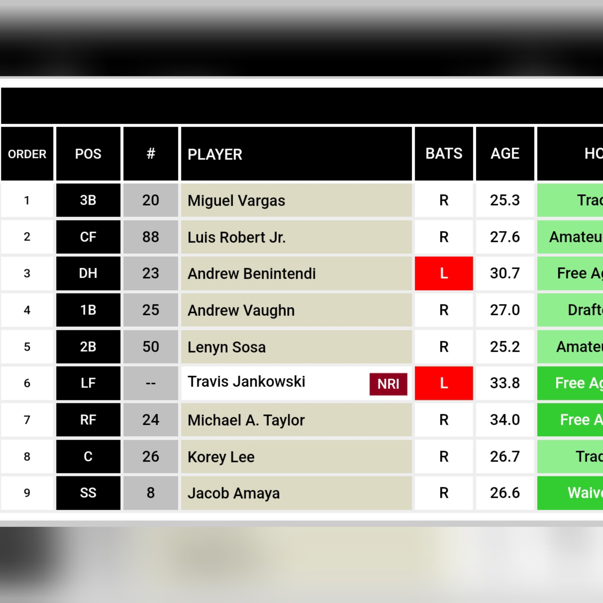 Lineup, rotação e bullpen dos #WhiteSox.