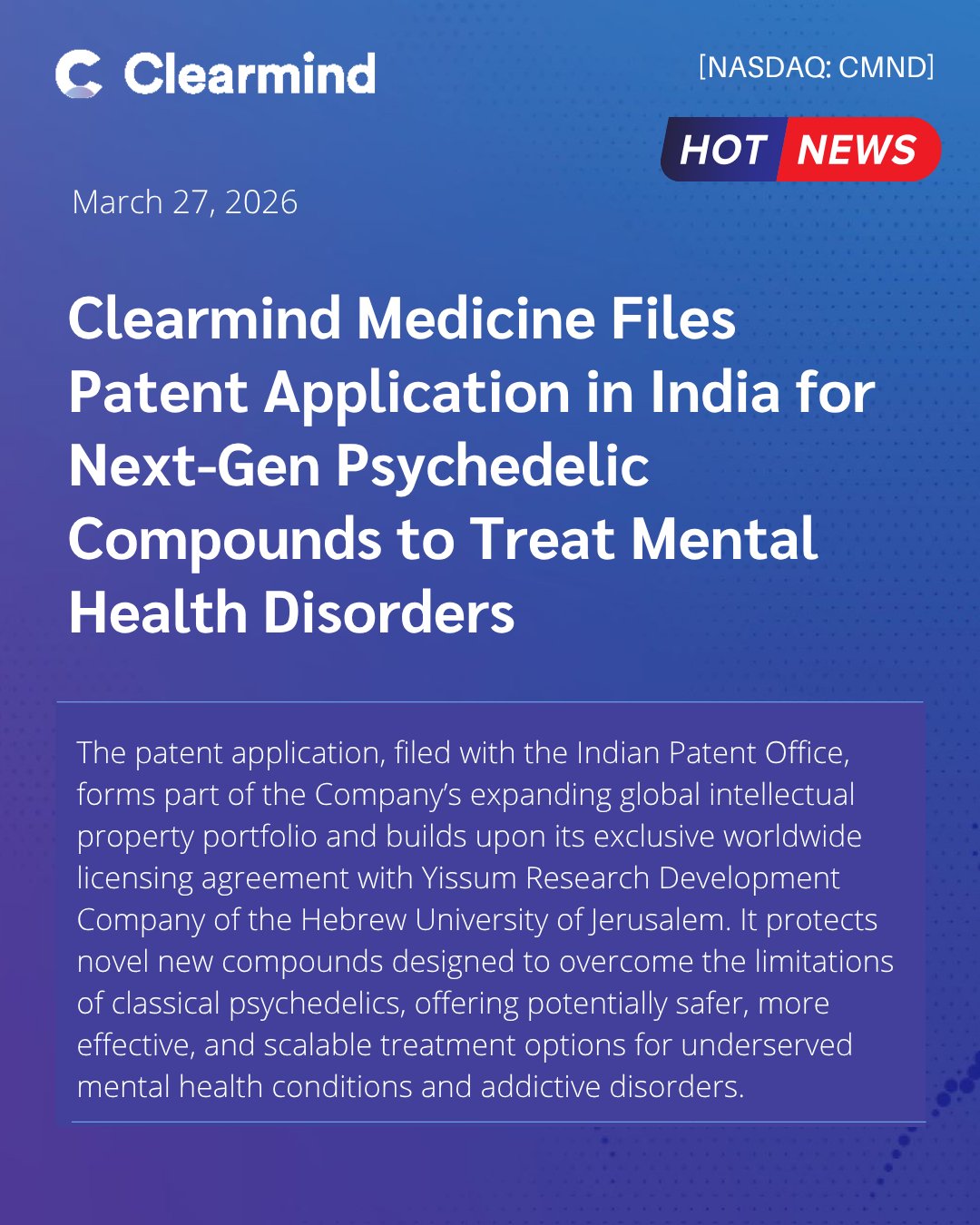 Clearmind Medicine (CSE: CMND, FSE: CWY) develops novel psychedelic medicines to solve widespread, yet under-served, health problems. With a strong medical mana