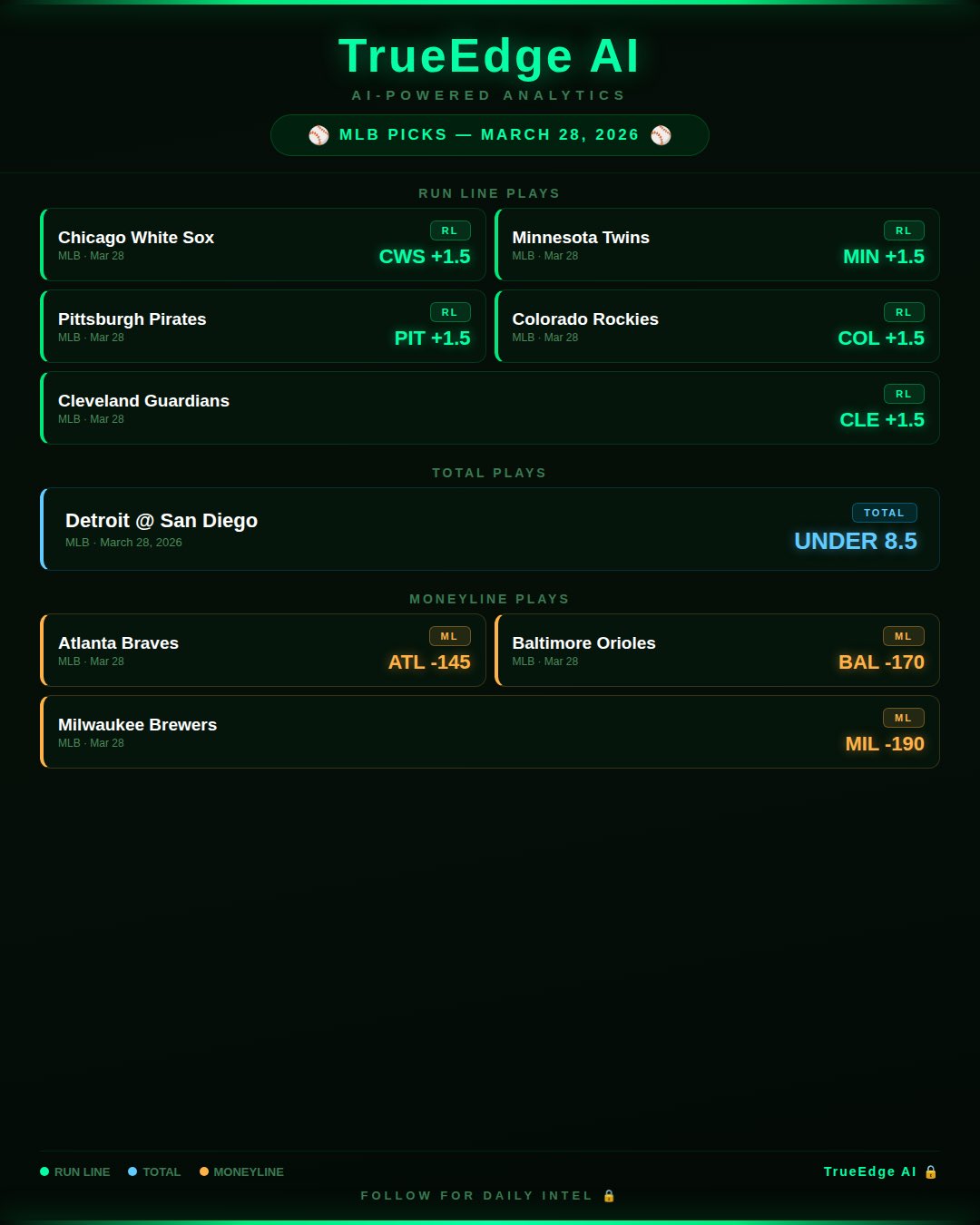 9 MLB edges today. Run lines across the board — CWS, MIN, PIT, COL, and CLE all getting the points. ATL, BAL, and MIL on the ML. DET/SD staying under. Model is locked in. ⚾🔒