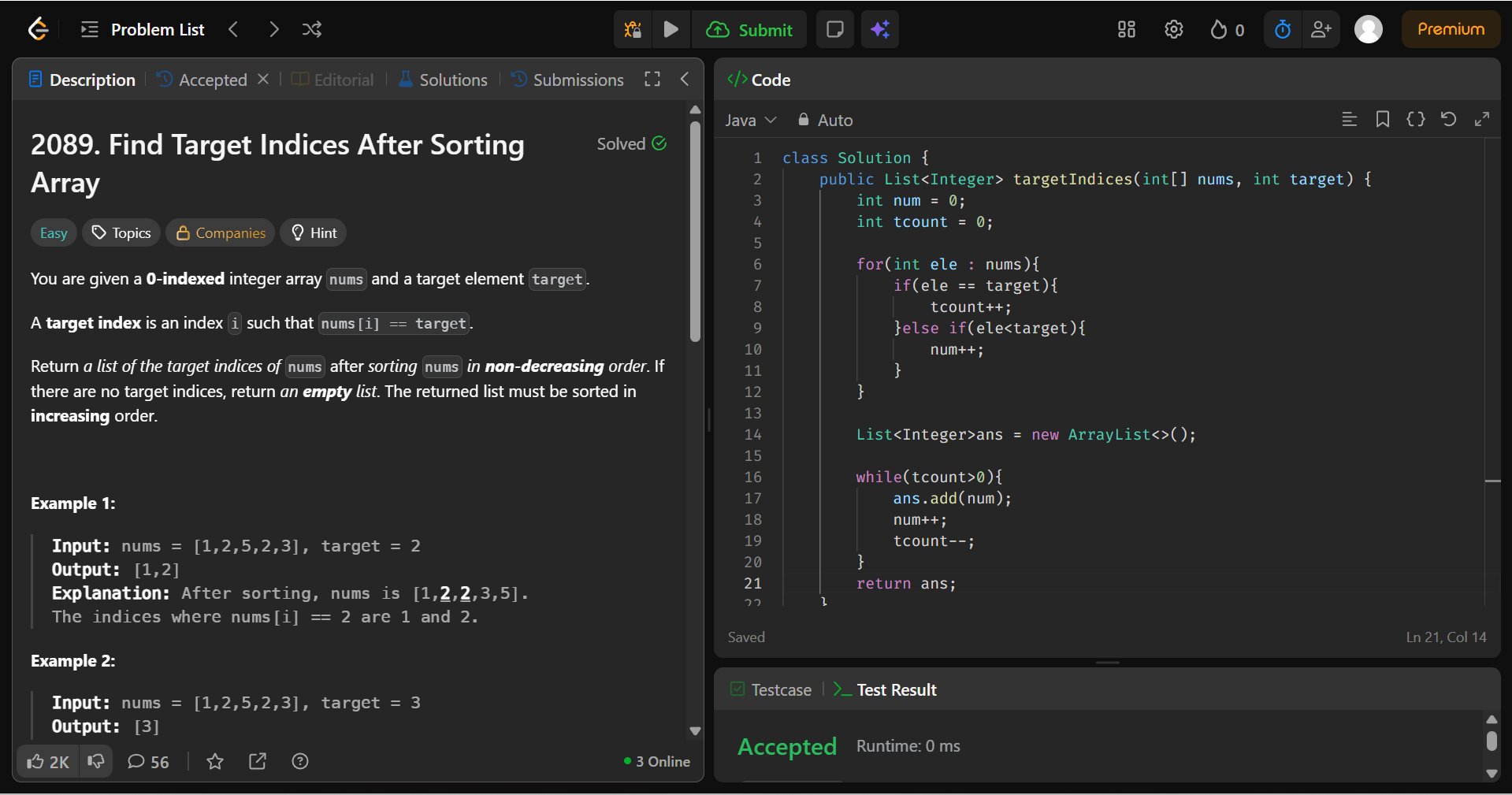 ✅Solved: Find Target Indices After Sorting Array