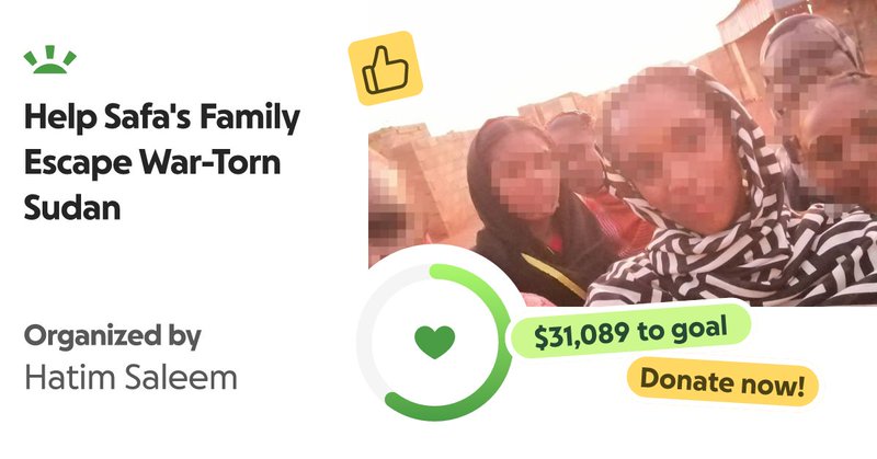 From gofundme.comHello, My name is Hatim Saleem. I am originally from Sudan and migrated to Amer… Hatim Saleem needs your support for Help Safa's Family Escape War-Torn Sudan