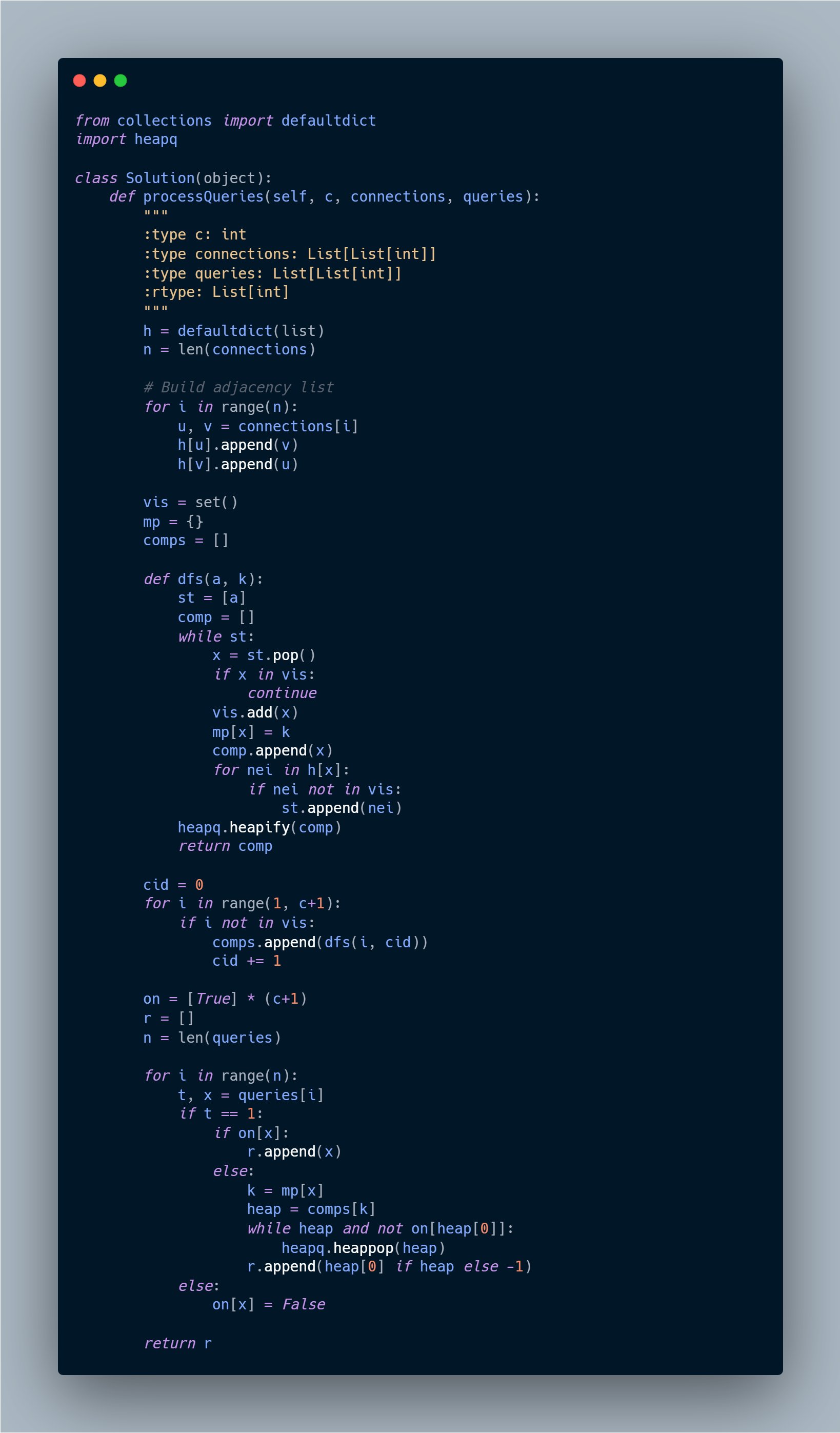 Ayush Awasthi @otakuayush_ · Nov 6, 2025 📌 POTD: LeetCode 3607 — Power Grid Maintenance 🐍 Python | DFS + Min-Heap ✅ Graph Connectivity ⏱ O(n + q log n) Time | 💾 O(n) Space Solutioleetcode.com/problems/power…8Vn #Python #LeetCode #Graph #DFS #Heap #POTD #100DaysOfCode #DSA #Algorithms #StriverSheTuc 1 11 159