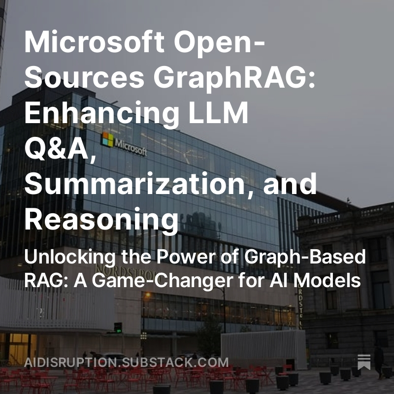 Meng Li @dlimeng192048 · Jul 3, 2024 Unlocking the Power of #Graph-Based #RAG: A Game-Changer for #AI #Models #Microsoft #open-sourced #GraphRAG to enhance #search, Q&A, summarization, and reasoning in large models using graph structures for better data #understanding and #retrieval. open.substack.com/pub/aidisrupti… 40