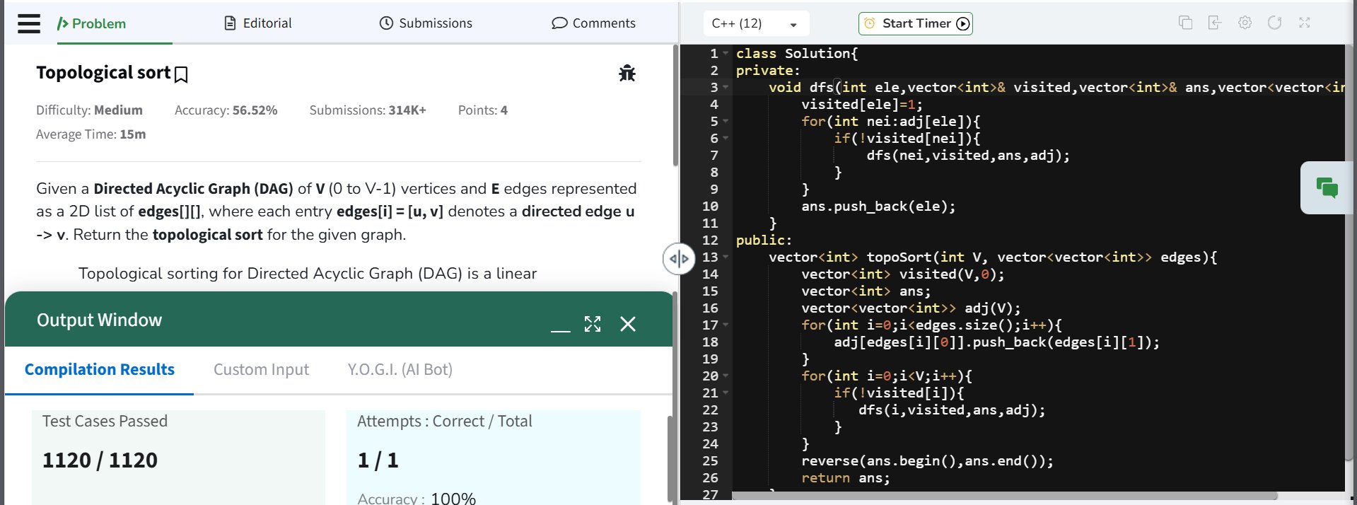 Juicy @Juicy____1 · Aug 28, 2025 👀 Day 89 of #100DaysOfDSAWithJuicy 📌 Q: Topo Sort (Graph) 📈 Hard | Kahn's Algorithm 🧩 💡 Solve using BFS, keep track of indegrees, push nodes with 0 indegree, repeat! #DSA #Graph #TopologicalSort #CofKppg 3 24