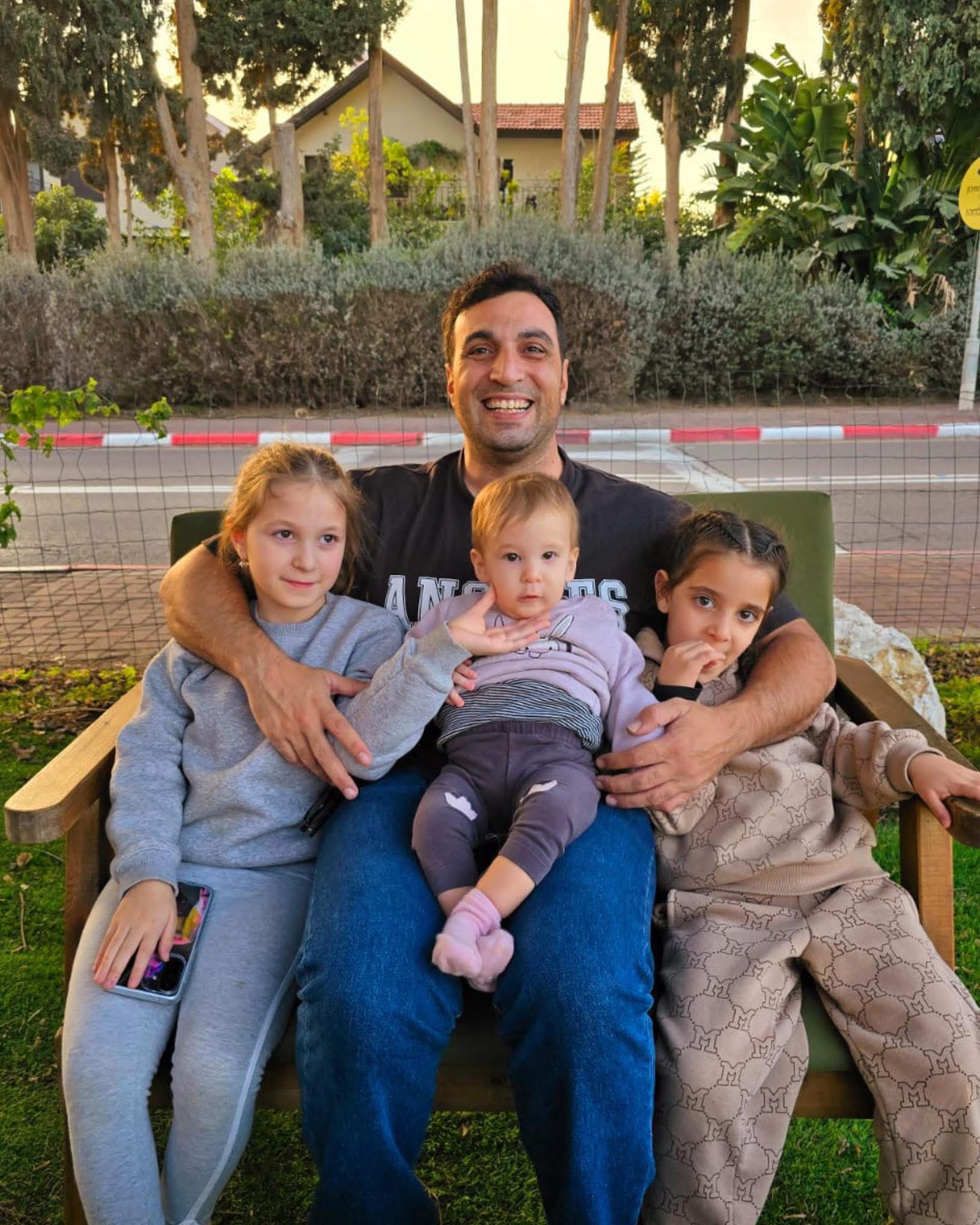 Yoni Asher from Kibbutz Nir Oz and his daughters Aviv and Raz who were abducted along with their mother Doron from Kibbutz Kfar Aza and her baby daughter who was born after her return from captivity.