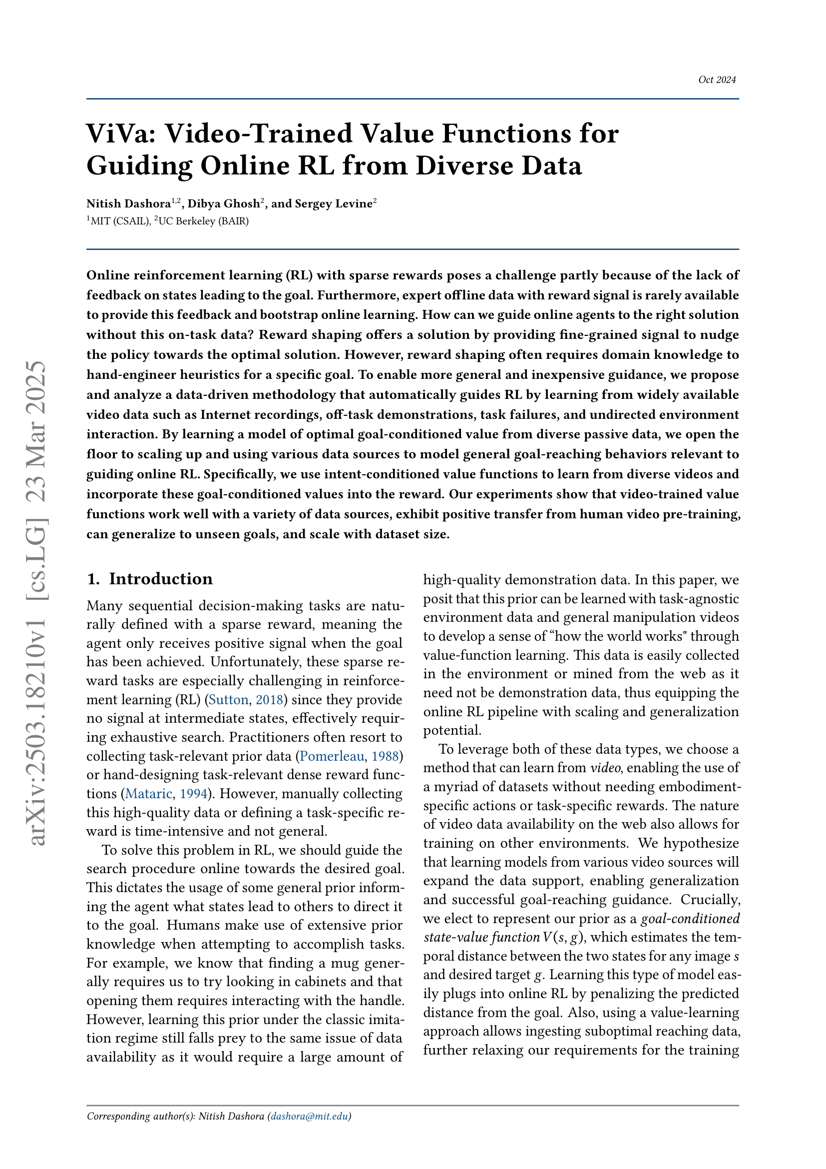 ⭕️ The paper proposes training a goal-conditioned value function \(V(s,g)\) from large, action-free video (e.g.