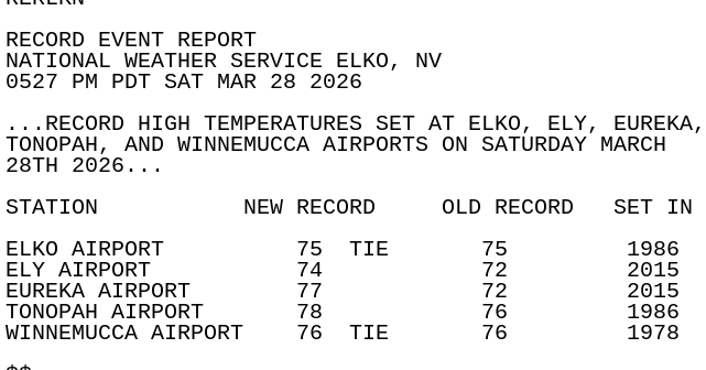 #LKN issues Record Event Report (RER) at Mar 28, 5:27 PM PDT ...RECORD HIGH TEMPERATURES SET AT ELKO, ELY, EUREKA, TONOPAH, AND WINNEMUCCA AIRPORTS ON SATURDAY MARCH 28TH 2026... mesonet.agron.iastate.edu/p.php?pid=2026โฆ
