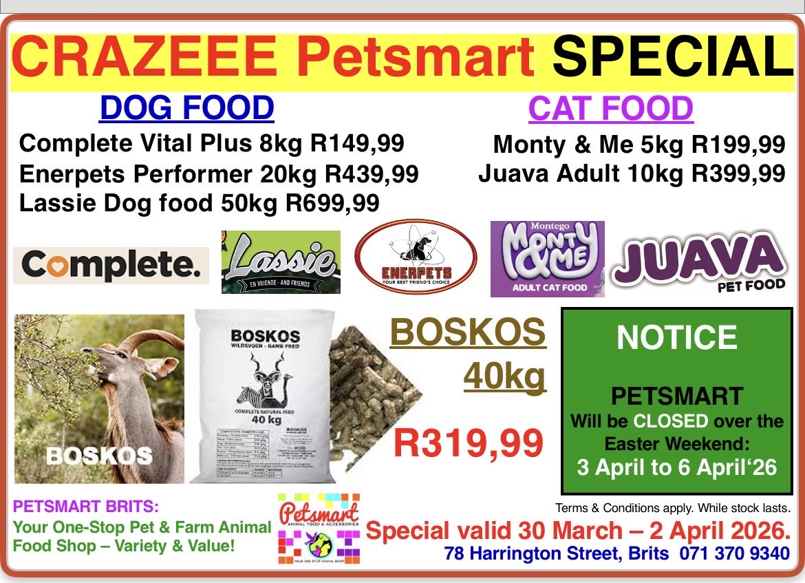 Petsmart Brits : Your One-Stop Pet & Farm Animal Food Shop – Variety & Value!” 🤗 78 Harrington str, Brits 0713709340q