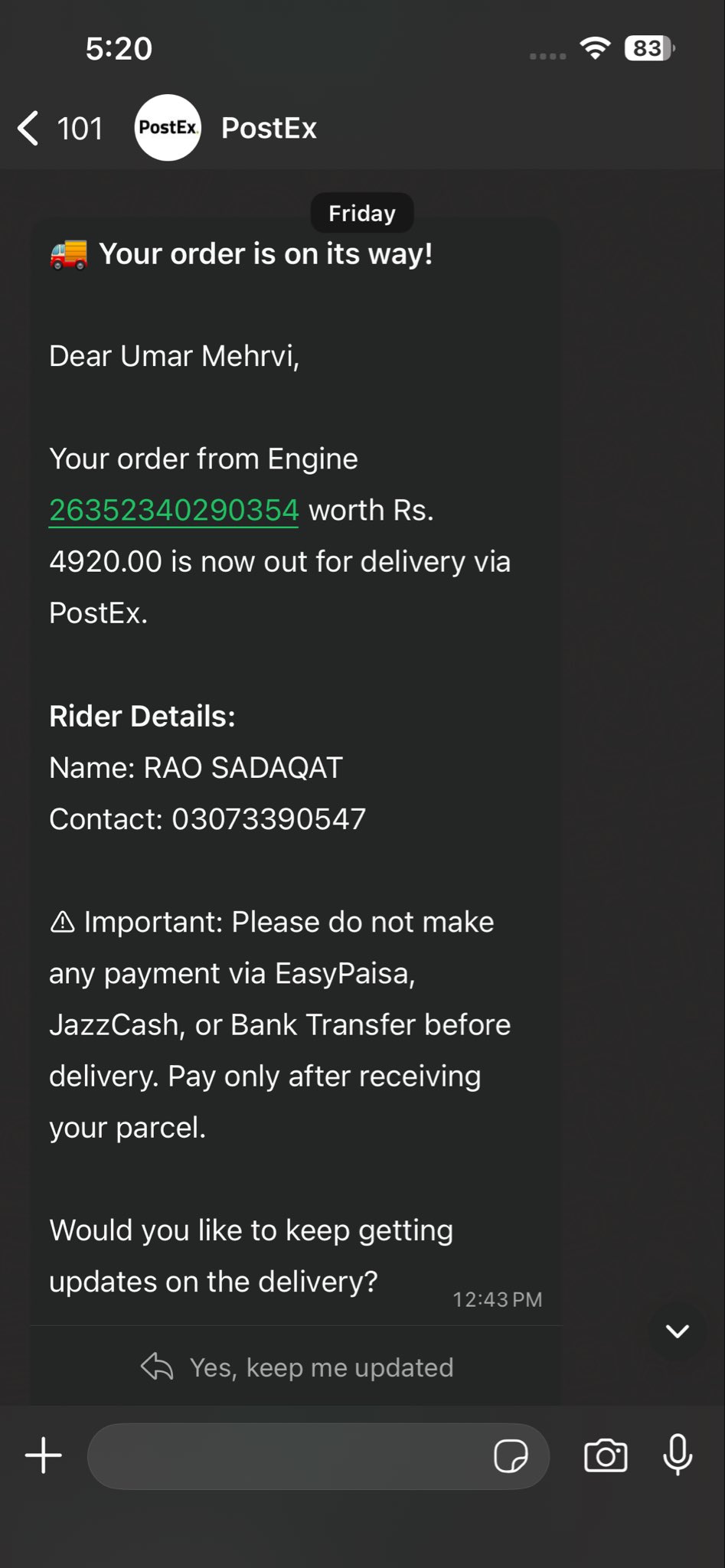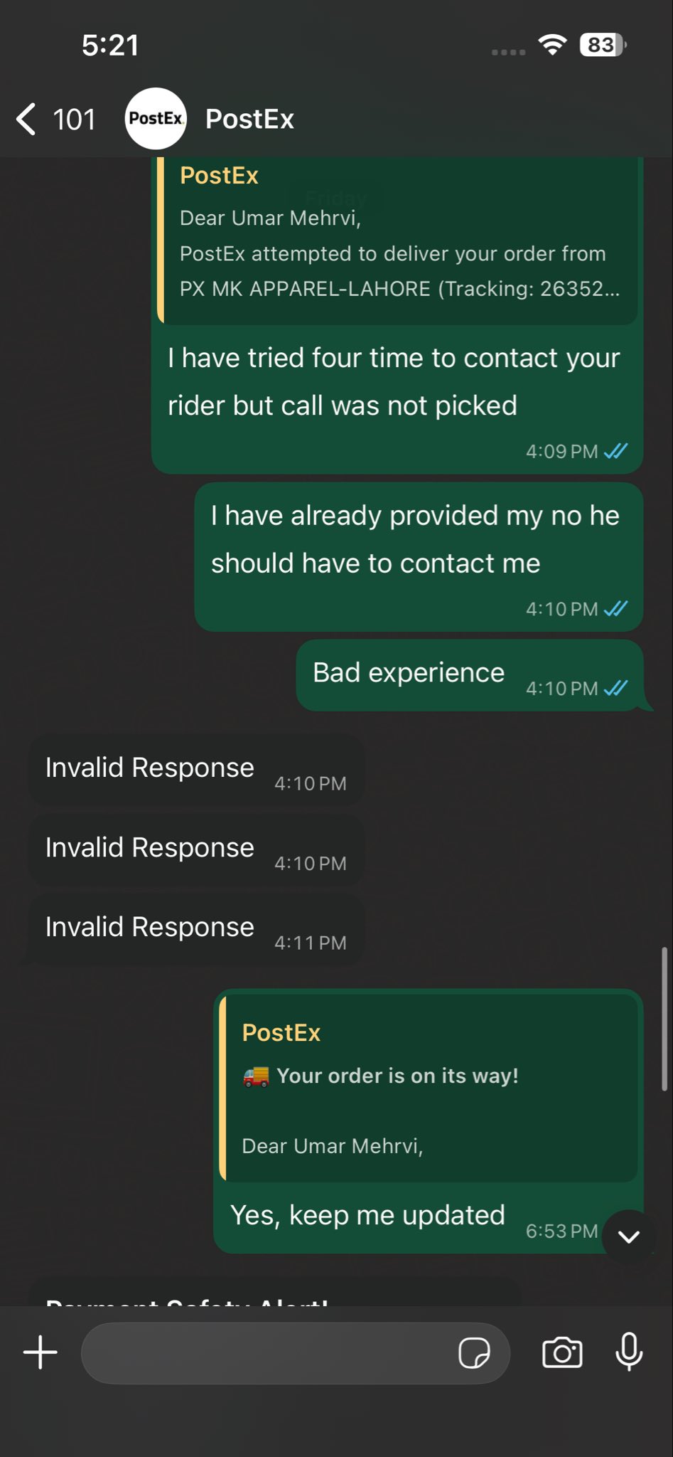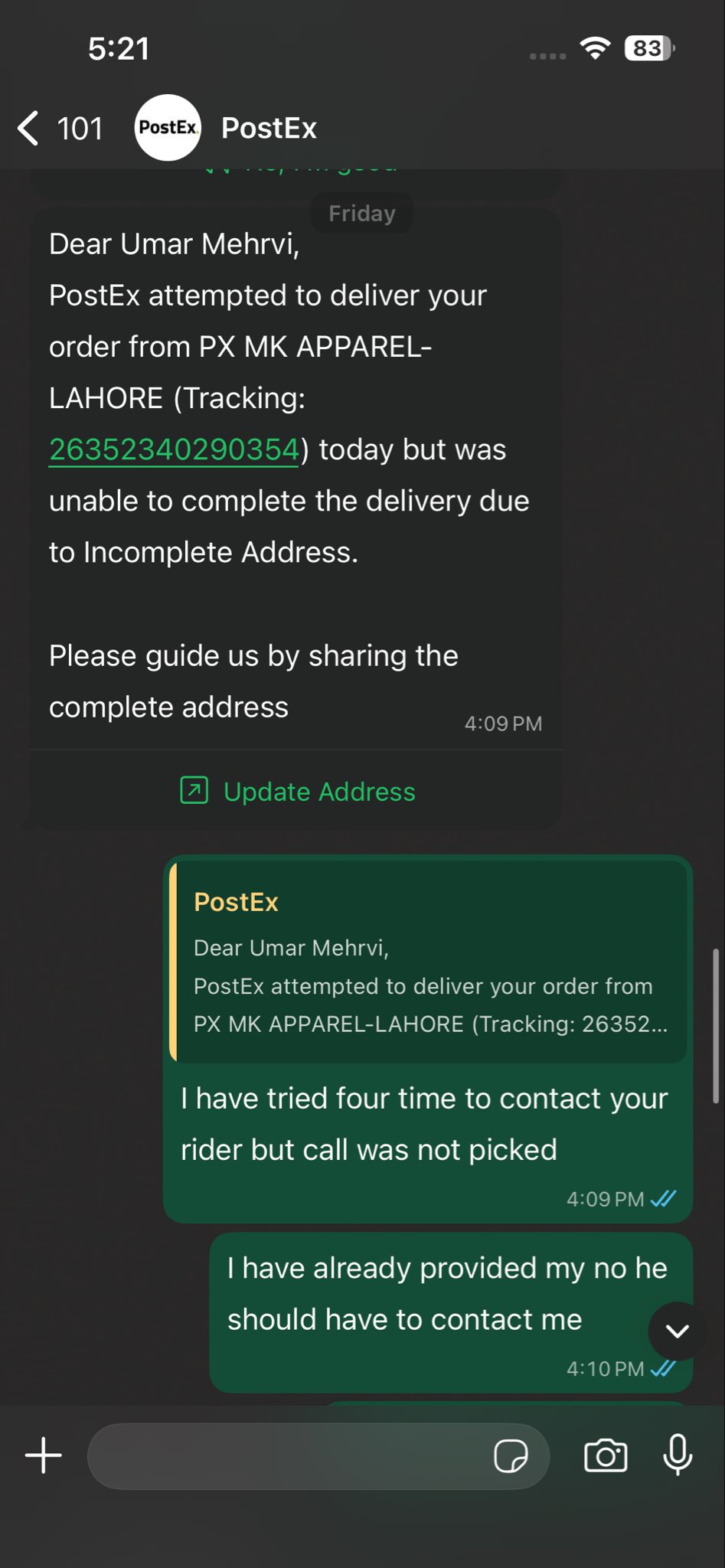 Ordered from #engine, they reduced order first without informing me. Passed it to Postex for delivery, but the assigned rider didn't respond to my 10+ calls and even don't call me for address confirmation and Order returned!i