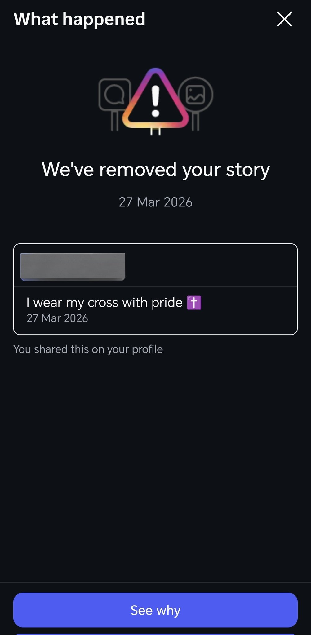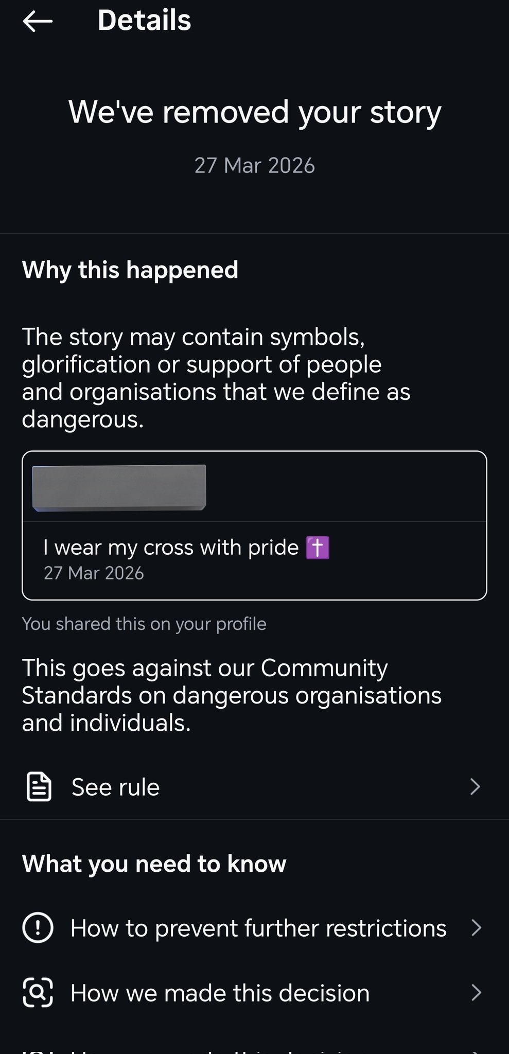 I then get a warning that "The story may contain glorification or support of people&organisations that we define as dangerous" Then I'm informed my story has been removed!