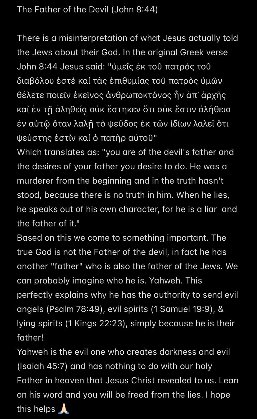 @Classicist9999 Judeo Christian’s secretly worship the wrong father but they will argue you through thick and thin he’s the father of Jesus. That wrong father is Yahweh. Yahweh is not the same Father that Jesus revealed to us.