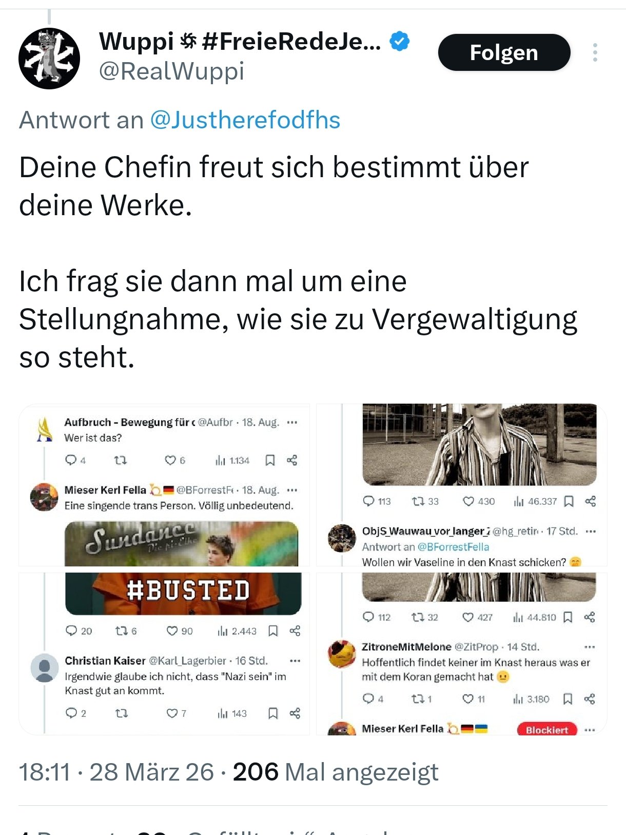 Und nein, sorry, ich hab nichts dergleichen gegoogelt. Zeit, dieses ewig primitive Genderbashing hinter uns zu lassen. Weder lass ich mich in Sippenhaft nehmen noch lass ich mir vorschreiben, wie ich meine Oberdeppen in der gleichen Geschlechterkohorte nacherziehen müsse. (Blöde Sprüche zu) Sexismus tariere ich standartmässig als default ebenso postwendend wie pauschales Blamegame mir sowas von aufn Sack geht.