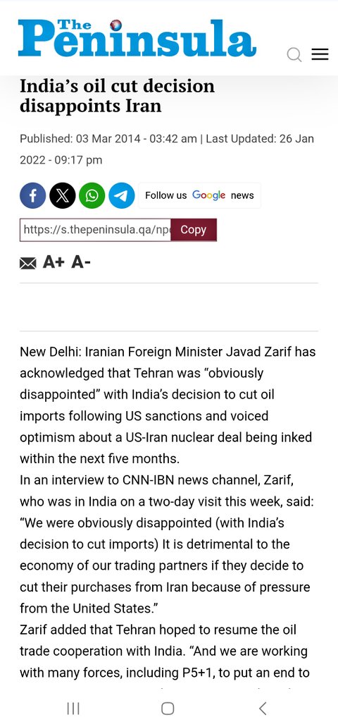 Iran was disappointed when India cut oil supplies under US pressure: Iran FM Zarif to CNN-IBN.
