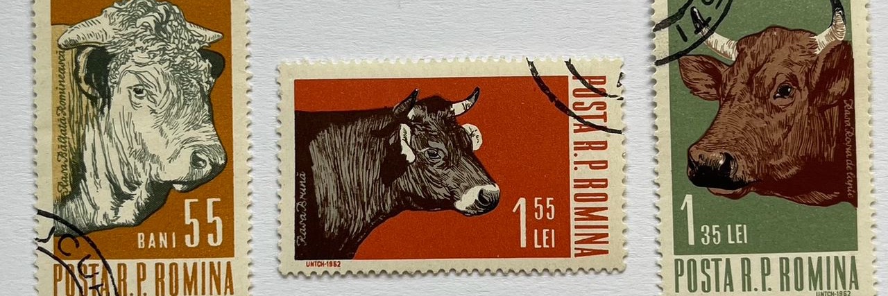 I collect stamps depicting cows, calves, bulls, cattle.