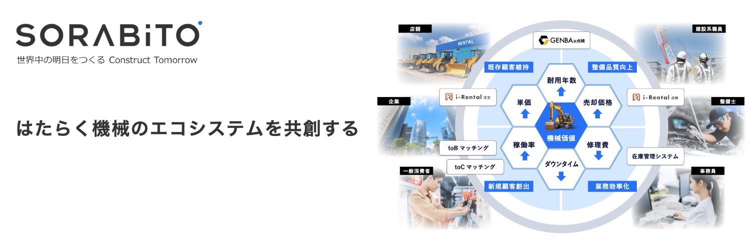SORABITO株式会社の創業者|IVS2016Fall優勝|世界中の明日をつくるをミッションに、現場の生産性向上を実現する建機レンタルDX「i-Rental」注文・点検(特自検対応)・AI、建設現場向け「GENBAx点検」、借りるをもっと身近にする「カリモ」を開発。業務自動化を実現する「産業特化対話AIラボ」を発足。