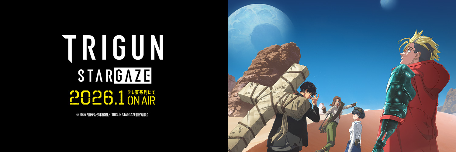 シリーズ完結編『TRIGUN STARGAZE』毎週土曜23時からテレ東系列にて放送中! ひとりの男が願い続けた理想とその結末がついにアニメーションで描かれる!『TRIGUN STAMPEDE』は全12話好評配信中! 推奨ハッシュタグ:#TRIGUN