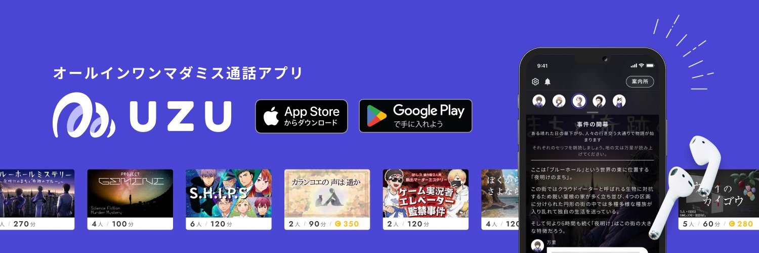 プレイヤー募集からプレイ、感想戦までアプリ一つで完結。音声通話・密談機能付き。1〜8名で遊べるマーダーミステリーを1,500シナリオ公開!シナリオによっては配信も可能! 投稿はウズスタジオ@uzustudio から!記録は で! お問合せはDMではなくアプリ内のお問合せフォームから🙏